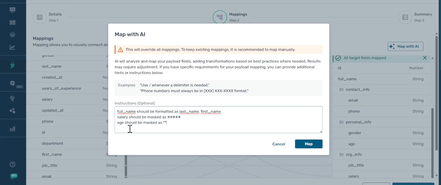 This new capability dramatically accelerates the mapping process. By understanding event payloads, suggesting field mappings, and generating transformation examples, it takes the manual heavy lifting out of schema alignment and data transformation.