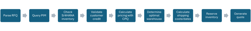 “When an RFQ arrives, extract requirements, check product information and cross/up selling opportunities in PIM, check inventory availability in S/4HANA, calculate pricing with margin rules, calculate shipping costs and delivery dates based on sourcing warehouse and destination and send it back all within 1 hour.”