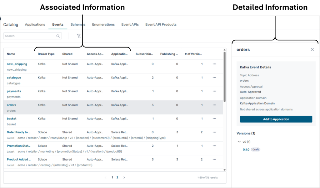 Just like a building has a blueprint that defines its structure, each event stream has a schema. Event Portal’s catalog displays both the event stream and its corresponding payload schema in one place, giving people a complete understanding of your event data.
