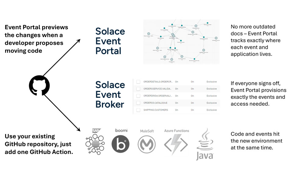 By tying configuration changes in Event Portal to pull requests and CI/CD pipeline integrations, teams ensure code and event configurations are deployed together. Event Portal provisions exactly what is needed for each environment, no more and no less. This keeps runtime behavior consistent and removes the risk of configuration drift.