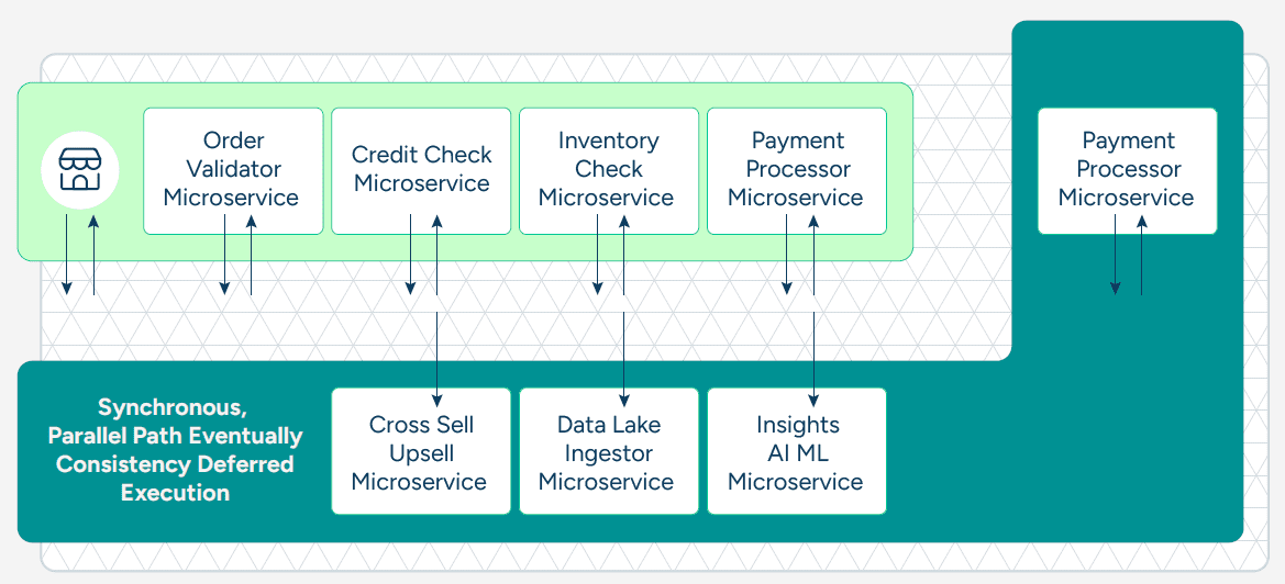 The event mesh provides guaranteed delivery, so the non-inline microservices can get the data a little after the fact, but in a throttled, guaranteed manner. The event stream flows into the systems in a parallel manner, thereby further improving performance and latency.