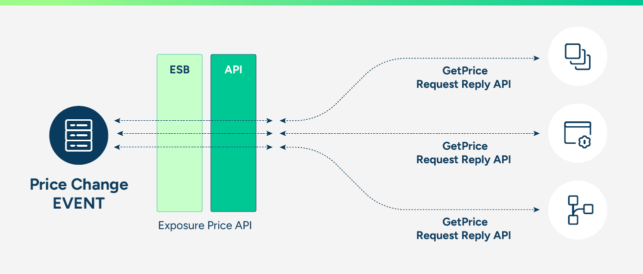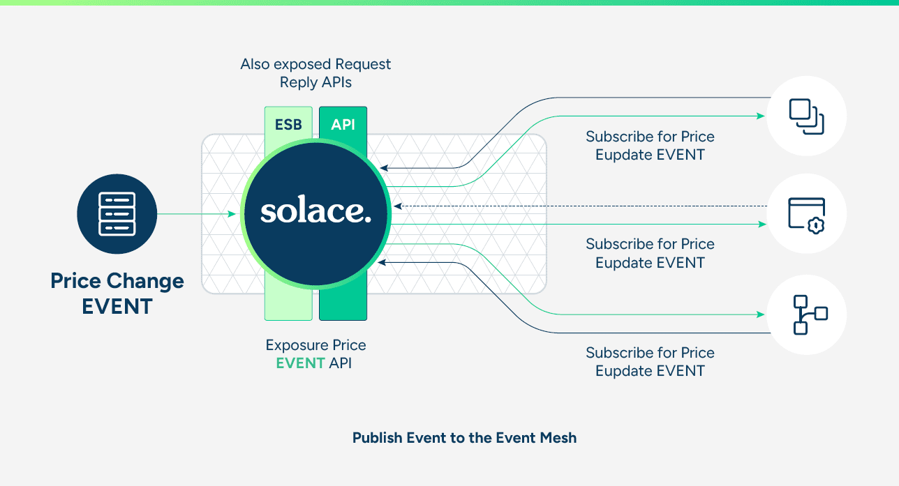 By event-enabling the price change and implementing EDA with an event mesh, downstream apps subscribe to the price change events and receive event notifications as they happen in real-time. The event mesh filters and only pushes the events that the downstream applications have subscribed to (in accordance with the topic taxonomy).