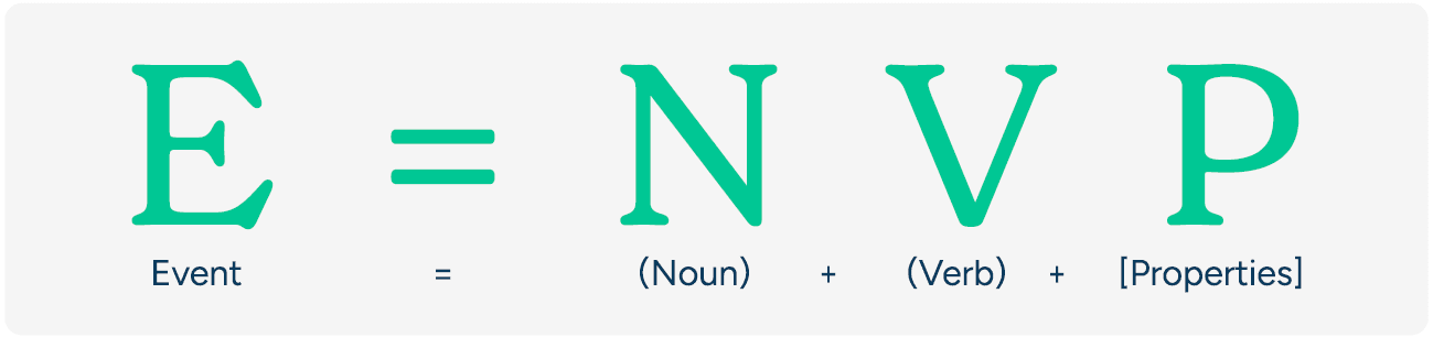 Just like a well-formed sentence in English, a well-modeled event has a subject (noun), an action (verb), and supporting details (context). That’s the idea behind the formula E = NVP, which stands for “Event = Noun + Verb + Properties”.